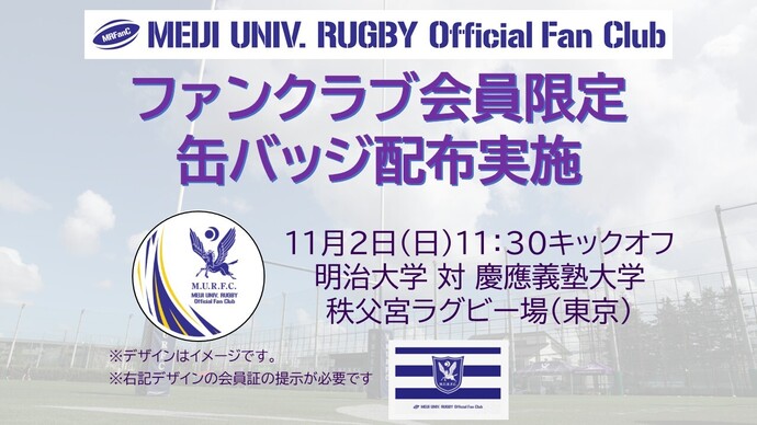 慶應義塾大学戦では、場外グッズ販売ブース(メインスタンド側多目的広場)にてご来場いただきました会員様限定に缶バッジを配布いたします!配布開始は●●時頃を予定しています。ぜひご来場いただき、缶バッジをお受取ください!