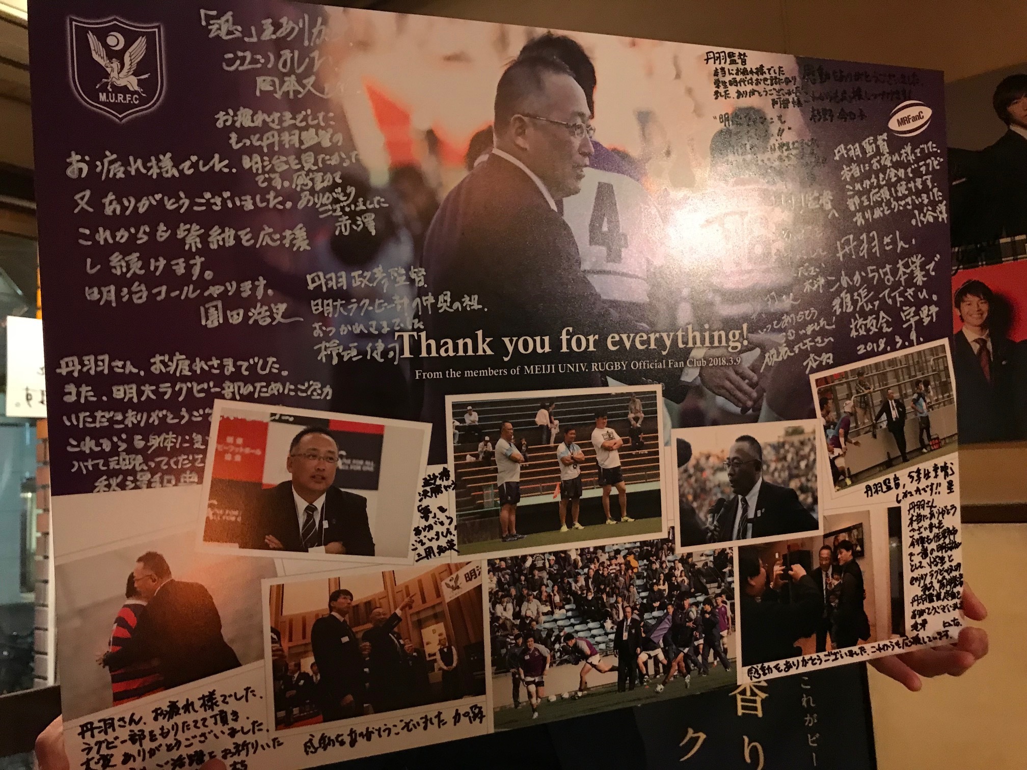 丹羽監督慰労会を開催しました! お知らせ 2018/03/09 Tweet 3/9(金)に今年度限りで退任する丹羽監督慰労会を開催しました!当日は40名近くの会員様にご参加いただきました。 監督へパネルやトロフィーの贈呈や、予定になかったポスター争奪じゃんけん大会等、会は大盛況のうちに終了しました。 ご参加いただきました皆様、ありがとうございました! そして丹羽監督、5年間お疲れ様でした! « 勝村咲Autumnバージョンが登場! | 大学春季大会Aグループ日程(関東大学ラグビーフットボール協会HP) » お知らせ一覧