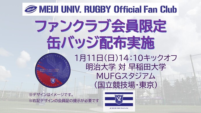 早稲田大学戦では、場外グッズ販売ブースにてご来場いただきました会員様限定に缶バッジを配布いたします!配布開始は11時45分頃を予定しています。ぜひご来場いただき、缶バッジをお受取ください!